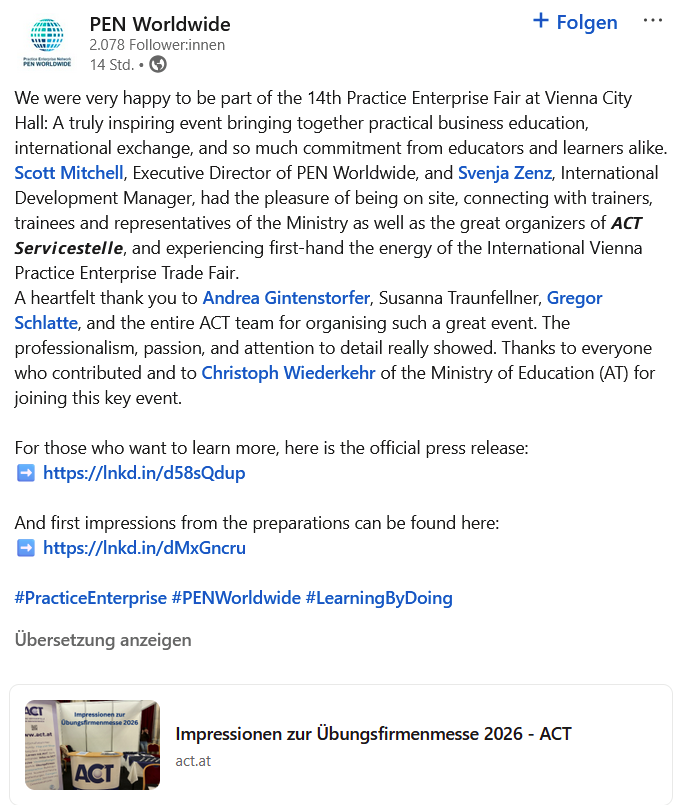 Die Organisation PEN Worldwide berichtete auf LinkedIn über ihren Besuch im Wiener Rathaus und die Eindrücke von der Veranstaltung.