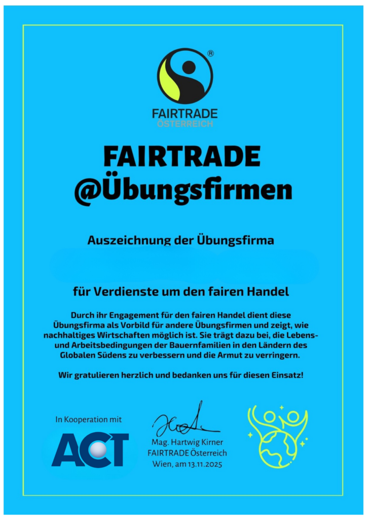 - Übungsfirmen mit FAIR gehandelten Produkten erhalten die Auszeichnung FAIRTRADE@Übungsfirmen.