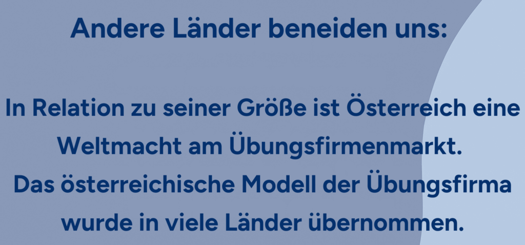 In anderen Ländern blickt man neidisch nach Österreich (in Relation zu seiner Größe ist Österreich eine Weltmacht am Übungsfirmenmarkt) und das österreichische Modell der Übungsfirma wurde in viele Länder übernommen.