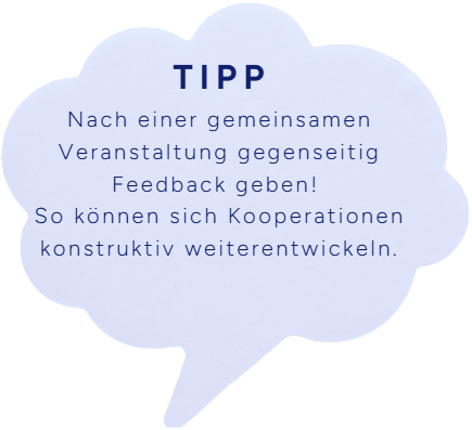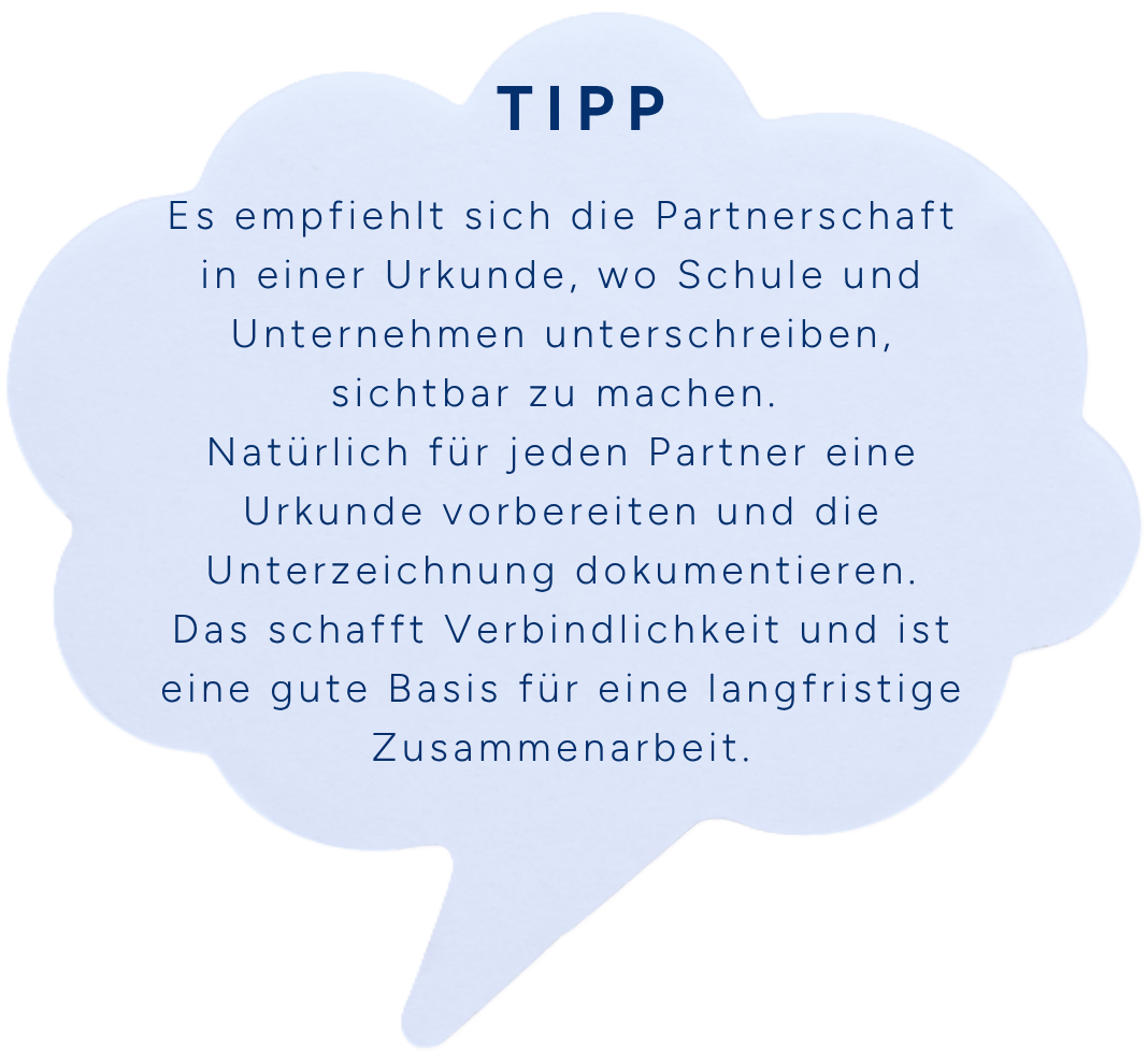 Am Beginn einer Partnerschaft empfehlen sich Aktivitäten, welche zeitlich begrenzt und mit einem überschaubaren Aufwand verbunden sind. Im Laufe der Zeit lernen die handelnden Personen einander besser kennen und umfangreichere Projekte mit höherem Koordinations- und Organisationsaufwand werden angestrebt. Die Zusammenarbeit mit dem Wirtschaftspartner wird dann vermutlich über den Rahmen einzelner Aktivitäten hinausreichen.