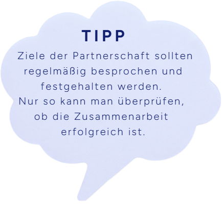 Für jede Kooperation sollte regelmäßig vereinbart werden, welche Ziele man erreichen möchte. Alle oben angeführten Gründe für eine Zusammenarbeit, können in attraktive Ziele für eine Partnerschaft umformuliert werden.