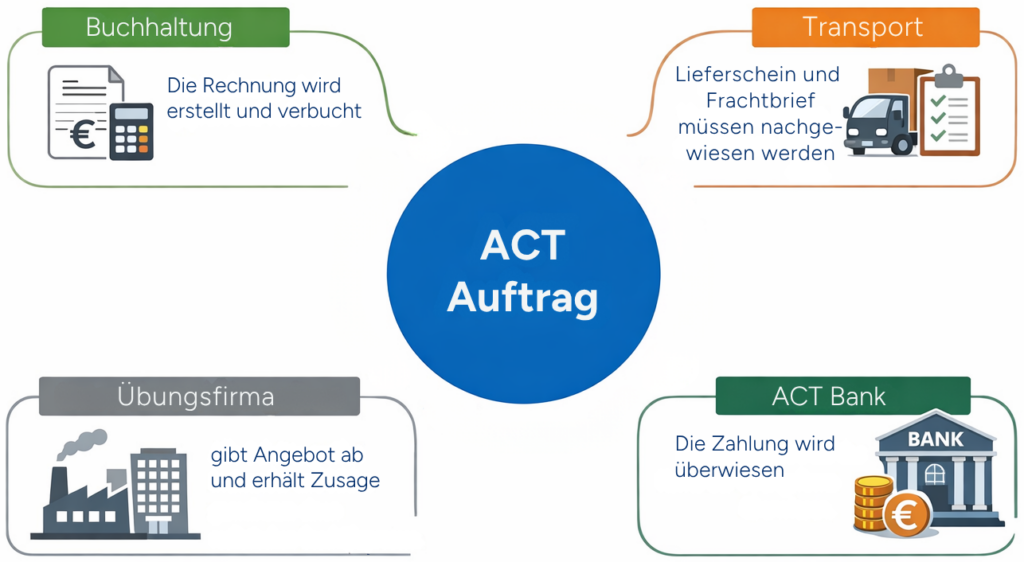 ACT Auftrag ist ein Bereich, in dem regelmäßig Produkte und Dienstleistungen ausgeschrieben werden. Übungsfirmen können darauf reagieren und innerhalb einer Frist verbindliche Angebote abgeben.