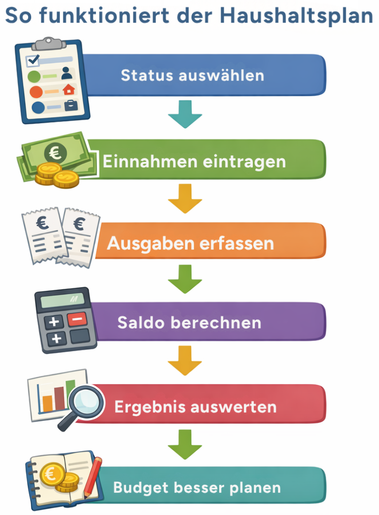 Mit dem Haushaltsplan lernen Schülerinnen und Schüler, Einnahmen und Ausgaben übersichtlich gegenüberzustellen. So wird sichtbar, wie viel Geld monatlich zur Verfügung steht und welche Ausgaben das Budget besonders stark beeinflussen.