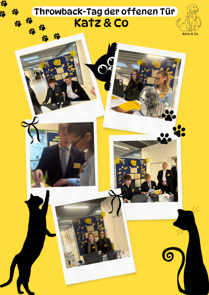 Die Übungsfirma Katz & Co nutzte den diesjährigen Tag der offenen Tür, um sich im Rahmen einer hausinternen Messe zu präsentieren. Ziel war es, den Besucherinnen und Besuchern einen praxisnahen Einblick in die Arbeitsweise einer modernen Übungsfirma zu geben.