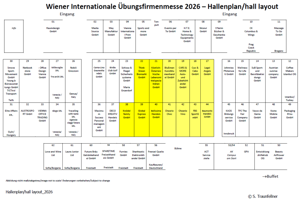 Home » Service » Veranstaltungen » Messen » Wiener Internationale Übungsfirmenmesse 2026 » Ausstellerliste & Hallenplan 2026 Ausstellerliste & Hallenplan 2026 Hallenplan Hallenplan für die Wiener Internationale Übungsfirmenmesse 2026. Ausstellerliste Eine Übersicht von Ausstellern mit ihren Firmennamen und Standorten. HallenplanDownload AusstellerlisteDownload